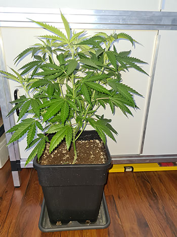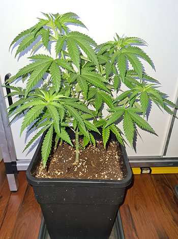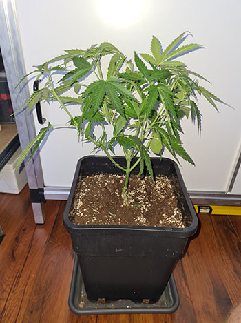 De eerste wietplant die ik onderhanden neem is de achterste en een van de twee grotere Mohammeds. Deze had ik vorige week al een knipbeurt gegeven, maar de dame was alweer net zo groot als voor de knipbeurt. Ze was 43 centimeters hoog en ik heb haar teruggesnoeid naar 34 centimeter. Zo krijgen de kleine plantjes nog even wat tijd om op gelijke hoogte te komen.