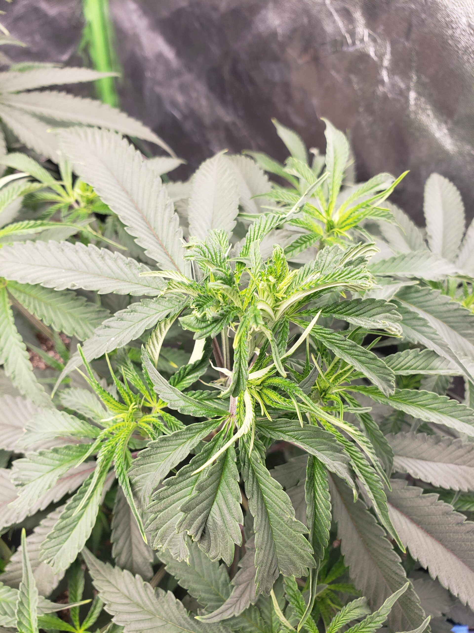 * Bij nader inzien, en na overleg met Micky, blijkt de oorzaak van de vervormde blaadjes niet het fimmen te zijn. Hoewel fimmen vergelijkbare beschadigde nieuwe wietbladeren veroorzaakt (zoals hier te zien is), is de oorzaak in dit geval een restje growstop in een plantenspuit, die Micky gebruikt heeft voor zijn bladvoeding. Growstop bevat plantenhormonen die de strek van wietplanten stoppen. Dit zorgde in dit geval voor de vreemde verfrommelde blaadjes.