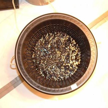 Voor een noodspoelbeurt heb je een schone emmer en een aquariumpomp met een aangesloten bruissteentje nodig. Plaats het bruissteentje onderin de emmer en vul hem met schoon aangezuurd water (pH-waarde 6,0) van kamertemperatuur. Zet de aquariumpomp aan.