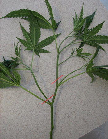 Je kunt in principe van ieder takje van een wietplant een gewortelde stek maken maar het gaat het beste met de nog fris groene uiteinden van een wiettak. Wanneer een stam hard en verhout is, kunnen wortels moeilijk door de bast heen groeien en zal het veel langer duren voor de stek wortels heeft. Kies dus een takje om een stek van te maken, tel drie nodes onder de bovenste groeipunt en snij de tak daaronder af. Minder dan drie nodes kan ook, dan hou je alleen een kleinere stek over.