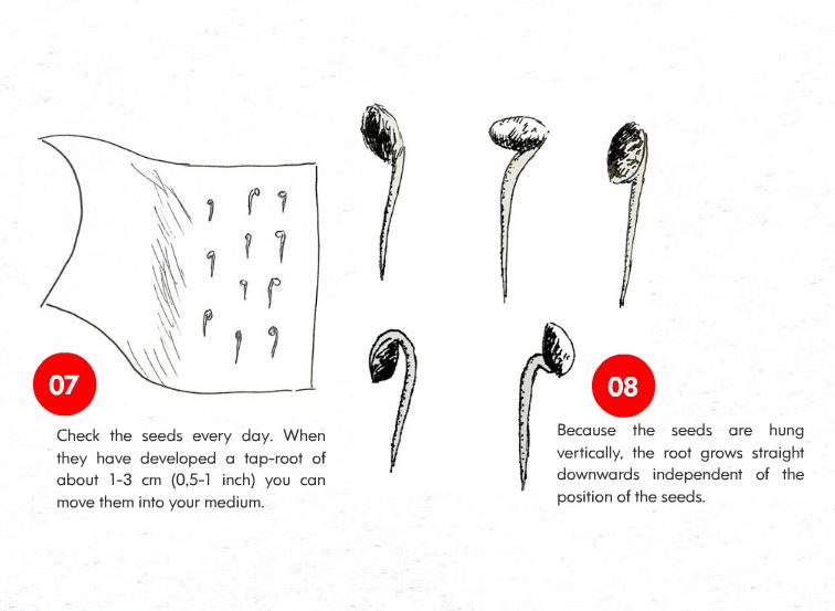 De kamertemperatuur is prima voor je zaadje en het gripzakje zorgt ervoor dat het niet uitdroogt. Doordat het verticaal hangt, zakt het teveel aan vocht naar beneden en groeit het worteltje ook mooi recht naar beneden. Na een paar dagen heeft je zaadje een mooi worteltje en kun je hem voorzichtig overplaatsen in een potje met aarde. Zie ook de kiem-minisite van Serious Seeds.