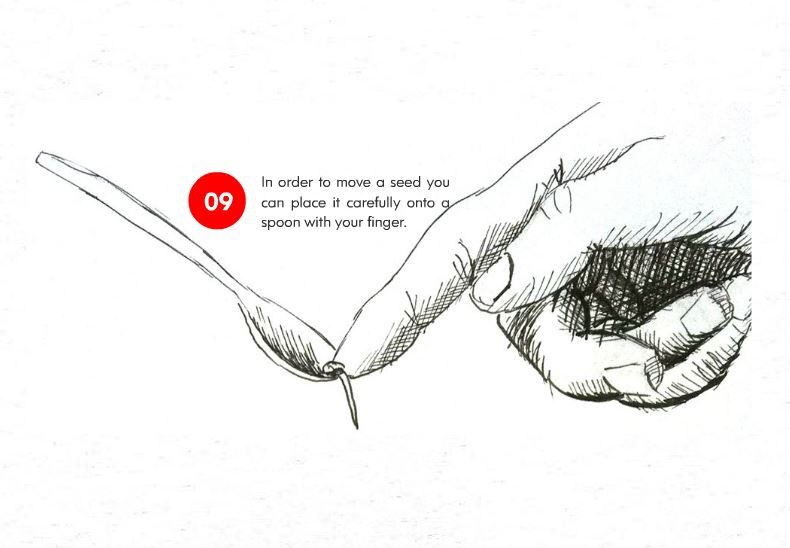 - Stap 2: verdeel je zaden met de puntige kant naar beneden over de helft van het natte vel keukenpapier en vouw het dubbel zodat je zaden tussen twee laagjes papier zitten.