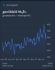 Ik dacht, laten we ook een kijkje nemen naar de klimaatgegevens in de kleine kast. De twee kweekkasten staan nog steeds in dezelfde kamer dus de gegevens wijken niet veel af van die in de CNNBS G-Kit XL. Er staan echter wel meer planten per vierkante meter, wat invloed zou kunnen hebben op de luchtvochtigheid. Maar zoals je in de grafiek kan zien blijkt het erg mee te vallen. De luchtvochtigheid is nog onder de 60 procent, dus dat gaat ook nog goed.
