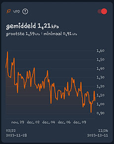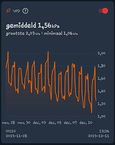 Het verschil in VPD is hierdoor natuurlijk ook toegenomen, van 0,11 kPa naar 0,35 kPa. Mocht je nou kweken met als richtlijn de VPD waarde, dan zie je maar hoe belangrijk het is om de juiste plek te vinden voor je meetsensor. De VPD waarde goed krijgen is niet echt eenvoudig, ben ik achter gekomen. Als je meer over de VPD-waarde wil weten, dan kun je hier verder lezen. Ik ben van plan om volgende week wat extra ventilators in de G-Kit XL te plaatsen, om te kijken of ik het verschil tussen de sensoren wat kleiner kan krijgen.