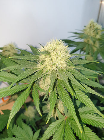 De Wedding Cake staat ook al in bloei maar die ziet er totaal anders uit. Daar waar de Pineapple Poisons al vol met bolle toppen zitten, zijn de topjes van de Wedding Cake nog erg klein, en zitten ze nog dicht op de stam. De bloeitijd van de Wedding Cake duurt zo’n 65 dagen, en dat komt neer op 9 weken en paar dagen. De Pineapple Poison heeft een bloeitijd van 8 tot 10 weken.
