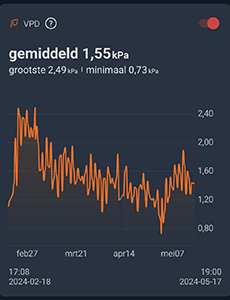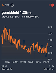 De gemiddelde luchtvochtigheid was 54,4 procent. Je kunt nu wel goed zien dat ik de controle over de luchtvochtigheid een beetje kwijt was aan het einde van de ronde. De gemiddelde VPD was 1,35 kPa en tussen de 1 en de 1,40 kPa zou goed moeten zijn…