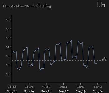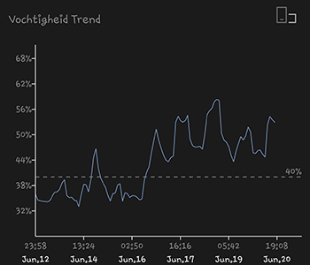 Op de grafiek van de luchtvochtigheid hieronder zien we halverwege de week ineens een klein sprongetje omhoog, wat is hier aan de hand? Nou het blijkt dat ik de Morning Glory iets te weinig te drinken had gegeven. Ik heb de laatste anderhalve week verzuimd om de dames in de ochtend een controlebezoekje te brengen. Hierdoor was het mij niet opgevallen dat de Chilipulver (een vochtsensor van IKEA) druk aan het knipperen was omdat de dames dorst hadden. Daarop heb ik natuurlijk meteen wat meer water gegeven, en dan klimt de luchtvochtigheid automatisch mee.