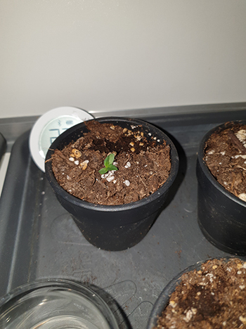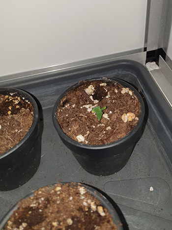 De 2 Sneeze baby’s zijn nog niet zo groot en komen net één centimeter boven de aarde uit. Ze zijn mooi groen en zien er sterk uit, wat ben ik blij met deze twee jongedames. Nu is de kweek voor mij namelijk echt van start gegaan. Het is de bedoeling – als alles verder goed loopt met het kiemen van de andere zaadjes – dat de Sneeze planten weer in gewone CNNBS G-Kit (met verhogingsset) blijven staan.