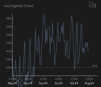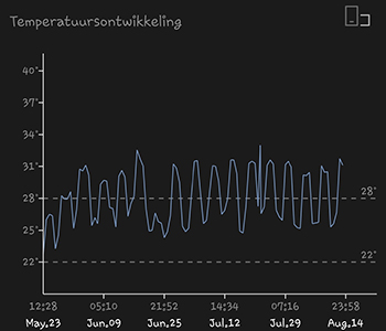 Het is me eindelijk gelukt om een mooie grafiek te genereren van de gehele kweekronde, op die van de luchtvochtigheid na dan. Door de slechte zomer van dit jaar is de temperatuur in de G-Kit XL redelijk stabiel geweest de afgelopen maanden. De luchtvochtigheid is toch wat lastiger onder controle te houden dan de temperatuur. Desalniettemin zijn de cijfers redelijk binnen de norm gebleven. Afgezien van de droogte in het begin van de kweekronde.