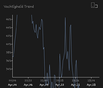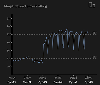 Het lichtschema staat natuurlijk nog op 18/6 (18 uur aan en 6 uur uit). De gemiddelde temperatuur van de afgelopen twee weken was 23,89 graden Celsius. Er is rond 9 april een duidelijke stijging in temperatuur te zien. Dat is de overstap van de 14 Watt LED lamp naar de 315 Watt CMH kweeklamp. Deze geeft natuurlijk ook meer warmte af dan de andere lamp. Het is ook goed te zien dat niet alle warmte de kamer verlaat waar mijn grote kweekkast staat. De temperatuur daalt niet meer zo ver als daarvoor, als de lamp uit is. Het is daarbij ook buiten wat warmer geworden de afgelopen dagen.