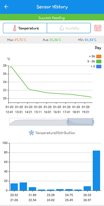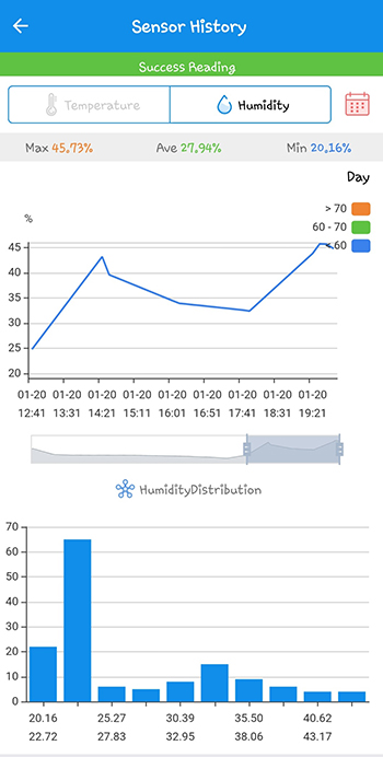 Hoe warm en hoe vochtig het nu is weet ik nog niet. Daarvoor heb ik een Inkbird IBS-TH1 Mini datalogger met Bluetooth gekocht. Dit is het eerste slimme apparaatje wat ik in de Bonanza ga plaatsen. Hiermee meet ik via de bijbehorende app, de temperatuur en de luchtvochtigheid in de kast. Ik zie deze meteen live en in een grafiek op mijn telefoon.