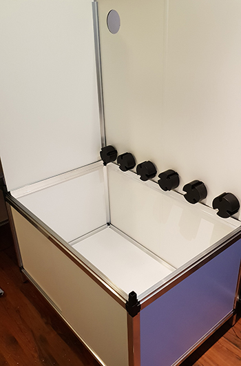 Bij het uitpakken en in elkaar zetten viel mij op dat deze kast niet van gefineerd spaanplaat is, zoals mijn oude en kleinere Bonanza kweekkast. Deze nieuwe kast is van PVC/XPS/PVC sandwichpanelen (foamplaat). Dit is superlicht en schuift zo op zijn plek. Dat maakt het in elkaar zetten van de kweekkast makkelijker, en de Bonanza ongevoelig voor eventuele waterschade. Het oude spaanplaat mocht niet nat worden maar de sandwichplaten hebben hier geen last van.