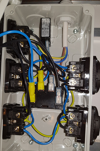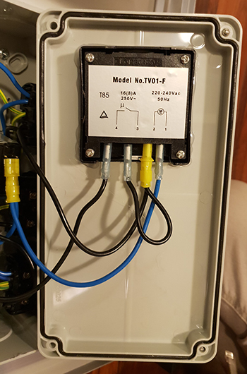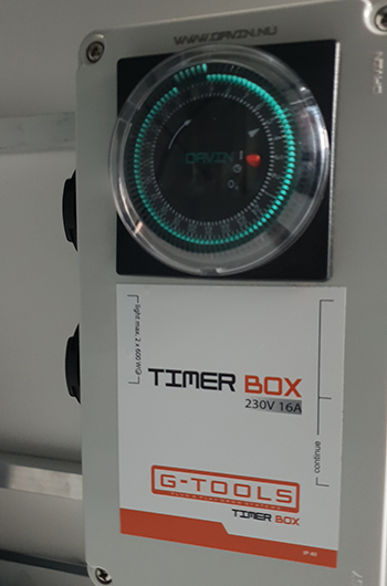 Ik zou Willie Wietman niet zijn, als ik ook niet even een kijkje zou nemen in de schakelkast aka Timer Box. Dat is een verdeeldoos met een tijdklok. De Timer Box heeft drie stopcontacten met continuestroom en twee geschakelde stopcontacten die met een relais op de tijdklok aangesloten zijn. Het relais zorgt ervoor dat de schakelklok niet belast wordt bij het opstarten, en dus niet kan doorbranden. Wel zo veilig! Zoals je kunt zien is dit allemaal netjes volgens de NEN 1010 en de NEN 3140 aangesloten.