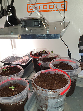 Inmiddels is het al een volle boel aan het worden in mijn kleinere CNNBS kweekkast. Om de opgepotte Mohammeds van licht te voorzien heb ik het Hans Panel van 100 Watt weer opgehangen. Hier heb ik een lichtschema op staan van 18/6 (18 uur aan en 6 uur uit). Rechts in de hoek is de microscoop nog steeds aan het opnemen maar helaas zit er weinig beweging in het zaadje. Het klimaat buiten de seedbox was erg droog afgelopen week. Maar nu de zes plantjes in potjes erbij staan is de lucht een stuk vochtiger geworden. Hopelijk komt het zaadje snel uit. In de seedbox links zitten op het moment nog drie zaadjes. Twee Mohammeds en één zaadje uit mijn mediwiet van de apotheek.