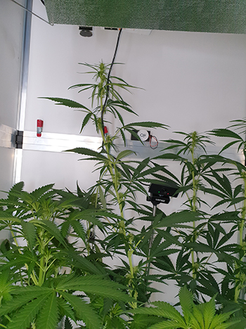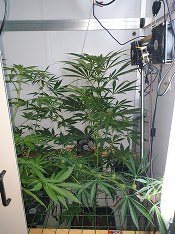 De overgebleven drie Jack Herer dames van DHS staan nu ook in bloei. De planten groeien nu ook nog best veel in de hoogte. Ik heb daarom een van de hoogste stammen om laten vallen, zodat ik de lamp weer wat lager in de kast kan hangen. Het licht wordt zo ook meteen gelijkmatiger over de planten verdeeld.