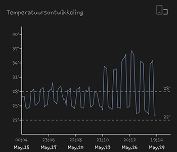 Eerst maar eens kijken of de wanden van de kast nat waren, maar dat was niet het geval. Ik kon niet goed in de kast kijken omdat de lamp aan stond en ben de volgende dag verder gaan zoeken. De twee sensoren waren onder het bladerdek terecht gekomen en gaven daardoor een te hoge waarde door. Na het wegknippen van de bladeren rond de sensoren heb ik de sensors uitgelezen. De gemiddelde temperatuur was de afgelopen 14 dagen 24,9 graden Celsius. De gemiddelde luchtvochtigheid over die periode was 61,13 procent. Dat is wat aan de hoge kant en ik heb het liever rond de 55 procent.