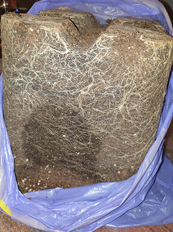 Het experiment met een vaste hoeveelheid water tegen lijkt geen invloed te hebben gehad op de ontwikkeling van de wortels van de planten. De wortels zijn in de aarde door de gehele pot terug te vinden. De foto is 26 uur nadat ze water hebben gehad genomen. De donkere plek was nog licht vochtig maar zeker niet nat. De rest van de aarde was droog en dat geldt ook voor de andere twee bloempotten.