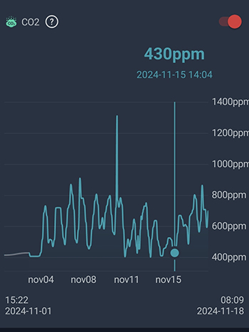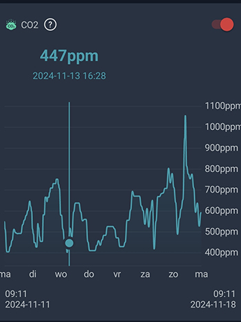 Als we naar de grafieken kijken zien we een duidelijk op en neer gaande grafiek. Die piek van de grafiek is rond 04:00 wanneer de lamp aangaat, dan zien we dat de CO2 waarde in de G-kit XL aan het dalen is. Om 16:00 wanneer de lamp uit gaat, zien we weer dat de CO2 waarde in de lucht toeneemt. De sensor is erg gevoelig, één keer richting de sensor blazen en de waarden lopen meteen op. Zo is te zien dat ik zondag veel in de kamer was, waar de G-kit staat, je ziet goede stijging in de CO2. Maar je kan dus zonder laboratoriumspullen zien wanneer de planten CO2 opnemen en wanneer niet. De lucht in de kamer waar de kasten staan is trouwens goed. 400 PPM is het niveau van de buitenlucht, en daar zit ik niet heel ver boven.