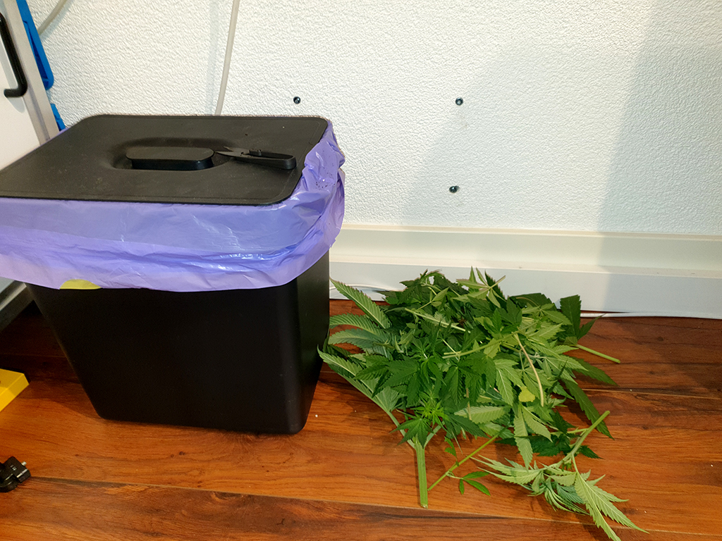Aan het knippen hield ik weer een klein bergje groenafval over. Het voordeel van maar twee planten in deze kast, is dan wel dat je de bodem makkelijk schoon kunt maken. Je past er makkelijk tussendoor met de stofzuigerslang. Daarna nog even een vochtig doekje eroverheen, en alles is weer mooi wit. De dame aan de linkerkant heeft een hoogte van 42 centimeter en de Sneeze rechts is 50 centimeter hoog. De LED kweeklamp heb ik 15 centimeter boven de dames hangen.