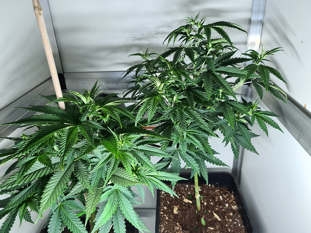 In de G-kit met verhogingsset staan mijn twee oudste Sneezes onder de 150 Watt G-Bars (het oude model). Ook deze dames hebben een knipbeurt gehad; het waren inmiddels twee kleine struiken geworden. De dames staan er erg mooi bij, al zeg ik het zelf. Zijn erg mooi donkergroen en zitten goed in het blad. Ook in deze kweekkast groeiden de twee planten echter ongelijk. De dame aan de rechterkant groeide een stuk sneller dan die aan de linkerkant. Ik heb dan ook de top uit de rechterplant geknipt zodat de dames bijna weer op gelijke hoogte groeien.