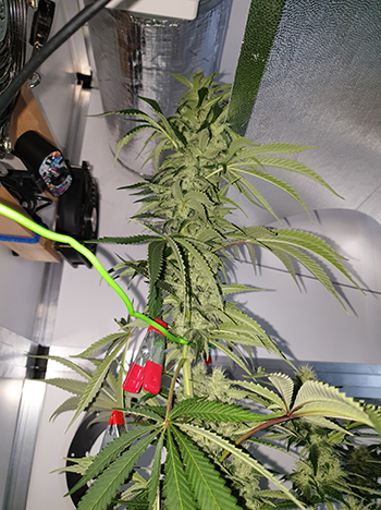 De Runtz x Layer Cake links in de kweekkast staat is een echte reus aan het worden. Met een 1 meter en 56 centimeter groeit de top van deze dame al voorbij het armatuur van de CMH lamp. Ik heb nog geprobeerd om de plant iets af te remmen door haar met wat gewichtjes te buigen, maar dat heeft helaas niet voldoende geholpen. Ze groeide gewoon lekker verder. Ik heb de plant maar wat van de bulb van de lamp af laten groeien anders zat ze er nu zeker tegenaan.