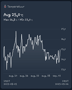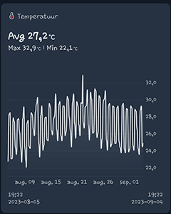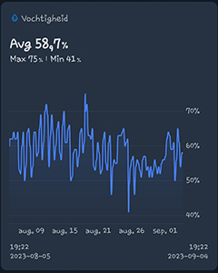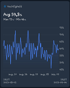 Ik heb de grote en de kleine G-Kit kweekkasten ook weer samen in één kamer staan. Na de dakdekkers die de lekkage kwamen verhelpen, heb ik de kleine kweekkast dus niet teruggezet in de andere kamer. De gemiddelde temperatuur in de G-Kit XL was de afgelopen maand 27,2 graden Celsius. De gemiddelde luchtvochtigheid was 58,7% en de VPD was 1,49 kPa. De luchtvochtigheid is dus wel wat aan de hoge kant maar er komen drogen dagen aan en dan zal het wel weer goed komen