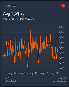 Dan zijn we aangekomen bij de klimaatgegevens van de kleine CNNBS G-Kit van 0,36 vierkante meter (60 x 60 cm). De gemiddelde temperatuur was hier 25 graden Celsius, De gemiddelde luchtvochtigheid was 59,8% en de VPD was 1,27 kPa.