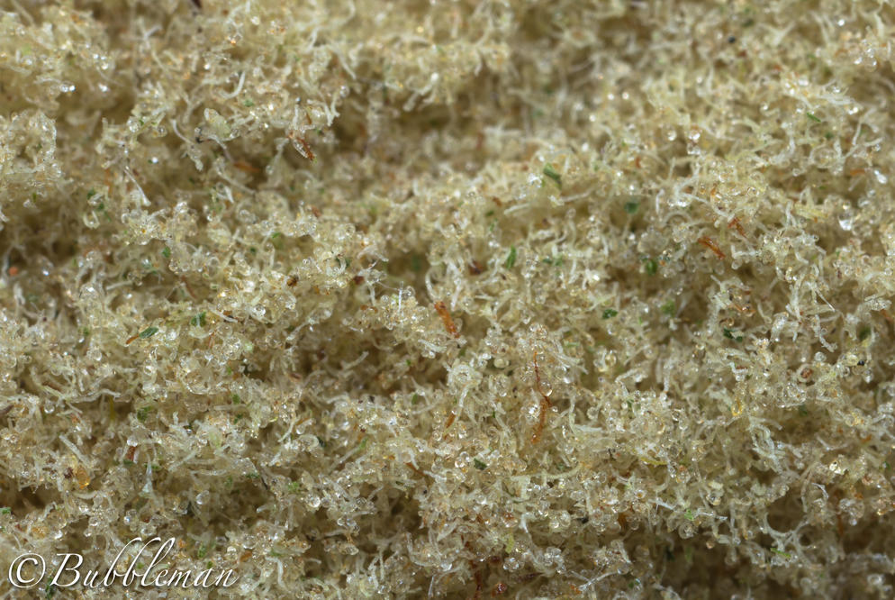 In de derde stap ga je de trichomen van hun stammetjes scheiden met behulp van de 70 micron zeef. Hoe langer je met deze stap bezig bent, hoe mooier je eindresultaat. De stammetjes van de trichomen zullen door het gaas vallen en je eindproduct blijft op het 70 micron gaas liggen. Als je tenminste voorzichtig te werk gaat met je bankpasje. Blijf je kief heel voorzichtig heen en weer halen over de zeef. Je kunt ook voorzichtig op het doek trommelen. Na een minuut of tien lijkt het al een stuk schoner, maar de echte 95% pure trichomen krijg je pas na ongeveer een half uur doorzeven. Het resultaat ziet er dan, als je alles goed hebt gedaan, ongeveer zo uit.