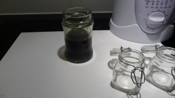 Om 9.30 ’s ochtends heb ik het wietpoeder/kokosoliemengsel in het frituurpannetje gezet en ’s avonds om 8 uur was het klaar. Het is inderdaad een dikke pasta/puree geworden en ik doe het in twee kleine glazen weckpotten die je bij de Blokker per vier stuks kunt kopen. De wietpasta moet wel supergezond zijn want het smaakt absoluut niet lekker, al denkt mijn zoon daar anders over. Ikzelf vind alleen de lucht ervan al vies ruiken en dacht, daar moet ik iets op bedenken want zo krijg ik de pasta echt niet naar binnen.