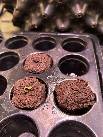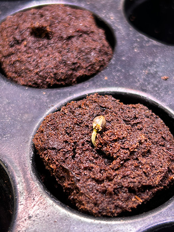 Mijn zaadjes ontkiem ik meestal niet in een koffiefilter maar in een stekplug van ROOT!T Het nadeel is dat je niet zo goed kunt zien of het zaadje daadwerkelijk aan het ontkiemen is. Maar het grote voordeel is dat je na het ontkiemen het plugje met de zaailing eenvoudig uit het bakje haalt en in de pot kunt planten.