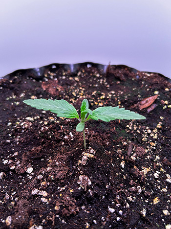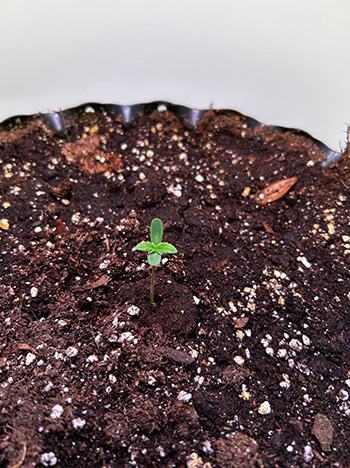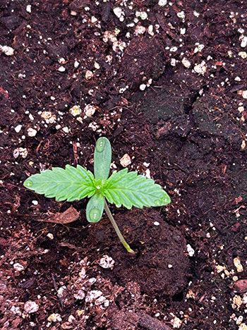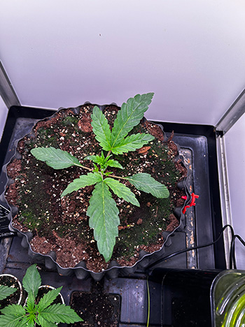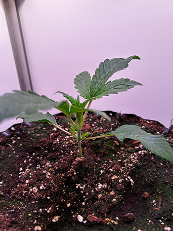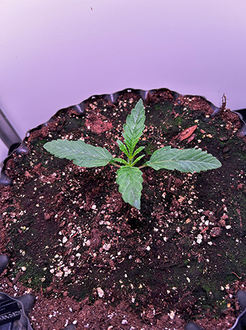 Het is week twee van de HighCloudz kweekronde en de zaailing doet het goed! Aan het einde van de eerste week werden de bladeren een beetje zwaar en moest ik de stam een beetje ondersteunen. Dit komt waarschijnlijk doordat het zaad bovenop de zaadplug lag, waardoor de stengel nog niet zo sterk was. Maar met de ondersteuning van wat aarde staat de zaailing mooi rechtop.