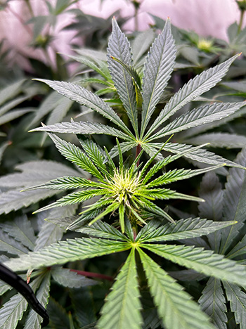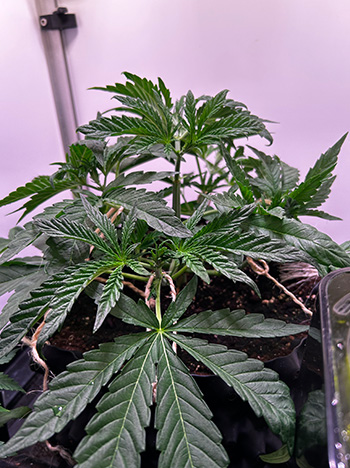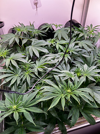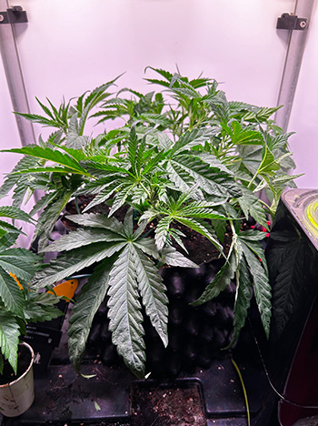 Op dit moment ben ik de overtollige voedingsstoffen dan ook aan het wegspoelen, en geef ik alleen CalMag en Plagron Power Buds. Het gevolg is verbrande bladpunten die naar beneden krullen. Ook is de kleur van de bladeren donkergroen. De nieuwe bladeren vertonen gelukkig geen tekenen van voedingsverbranding en ik hoop dat het spoelen voor een paar dagen het probleem zal oplossen.