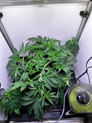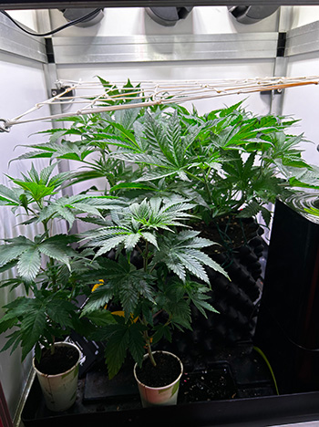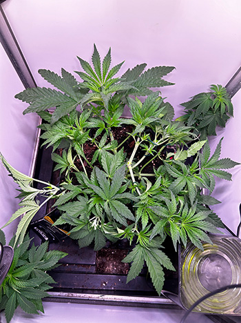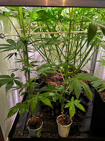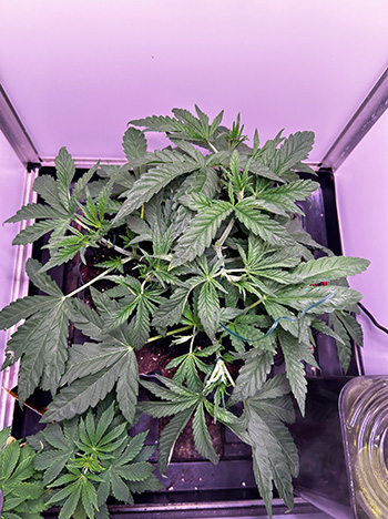 De twee kleinere planten leven natuurlijk ook nog. Ik had aanvankelijk drie zaadjes ontkiemd om de beste zaailing te kunnen kiezen, en ik kon het niet over mijn hart verkrijgen om ze daarna in de prullenbak te gooien. Nu groeien ze dus gewoon in hun kleine koffiebekertjes naast de grote HighCloudz. Ik voed ze regelmatig en ze lijken het prima te doen. Laten we zien of ze het tot de bloeifase halen.