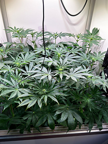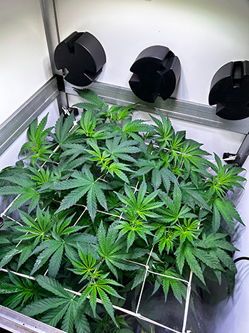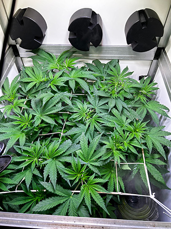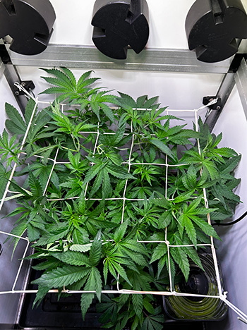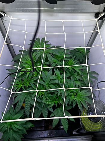 De scrog lijkt in ieder geval goed te werken. Alle grotere zijtakken hebben hun eigen plek in het net. Er waren enkele van de nieuwere zijtakken die iets sneller strekten. Maar deze heb ik terug in het net gestopt en nu hebben alle takken dezelfde hoogte. Er zijn nog geen tekenen van bloei, maar ik verwacht de eerste toppen ergens volgende week te zien als alles goed gaat.