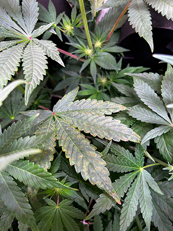 Sommige bladeren vertonen bruine vlekken. Mijn eerste gedachte was een voedingsblokkade, maar het zou ook wat anders kunnen zijn. Voor de zekerheid heb ik wat CalMag van Biobizz toegevoegd aan de voeding. Laten we zien hoe de plant hierop reageert.