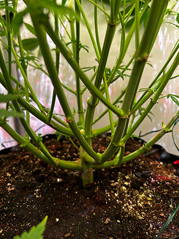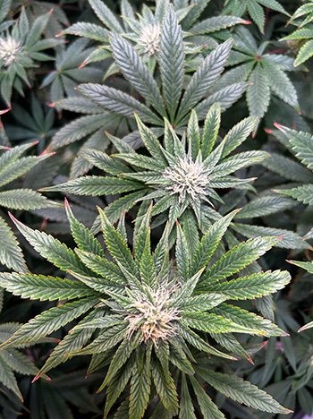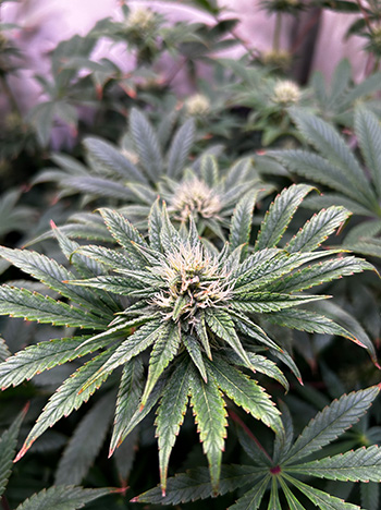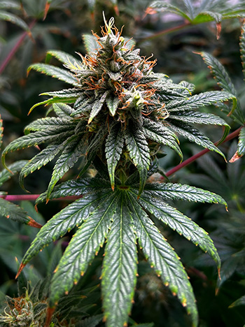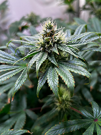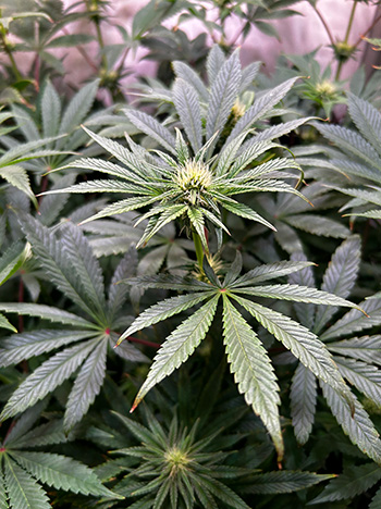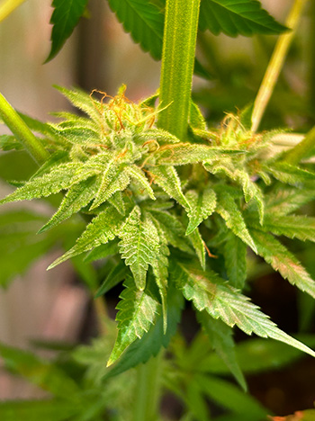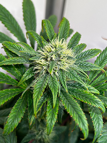 Het is op de foto’s nog niet zo zichtbaar, maar de trichomen groeien volop op de waaiervormige bladeren. Ik heb een paar HighCloudz kweekverslagen gezien waarbij de bladeren volledig bedekt waren met witte kristallen en ik hoop dat deze dame net zo ‘frosty’ wordt.