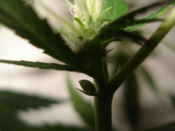 Bij vrouwelijke wietplanten groeien in de oksels van de takken druppelvormige knopjes (calyxen) met twee witte haartjes uit ieder knopje.