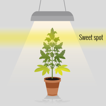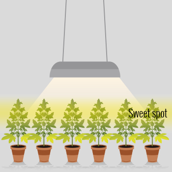 Tegelijkertijd zou je je wietplanten zo moeten kweken dat alle toppen op ongeveer dezelfde hoogte groeien. Dan profiteren alle toppen namelijk van de optimale sweet spot van de kweeklamp, kijk maar eens naar de illustraties hieronder.