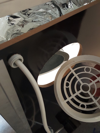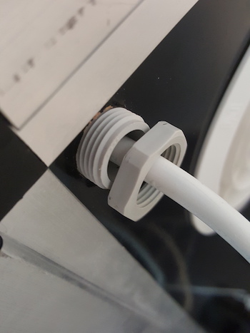Zorg dat de kast leeg is voor je aan dit kusje begint, haal de Spectrabox Pro ook even uit de kast en haal alle stekkers uit het ingebouwde stopcontact. Je begint met het losdraaien van de wartel waardoor de plug&play stekker van de kweekkast loopt. Als die los is kun je de kabel een stuk verder in de kast trekken zodat je ruimte genoeg hebt om de bovenkant van de kast los te halen en om te draaien. Vergeet, voor je dat doet ook niet even de luchtslang los te maken, deze schuift gewoon in de flens aan de achterkant en is dus zonder te schroeven los te maken.