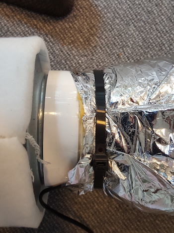 Nu alles los is kun je de bovenkant van de RollingStoned kweekkast in zijn geheel omhoog schuiven zodat die loskomt, en omdraaien. Leg hem gewoon omgekeerd op de kast, dan kun je overal goed bij. Knip de twee tie-wraps die om het filter zelf zitten los. Het filter met daaraan de luchtslang kun je nu in zijn geheel oppakken om gemakkelijker mee te werken. De luchtslang zit met een derde tie-wrap vast aan de ventilator, maar deze kun je laten zitten. De ventilator schuif namelijk gewoon sluitend over de flens van de filter heen, dus die kun je met slang en al, van de filter schuiven.