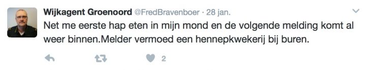 Over naar wijkagent Groenoord, ofwel Fred Bravenboer. Deze politieman is zoals veel van zijn collega’s in blauw uniform tegenwoordig ook actief op de sociale media. Twitter in dit geval, waar je de spannende avonturen van deze Schiedamse agent kan volgen. In teksten die overigens stikken van de spelfouten, maar dat terzijde.
